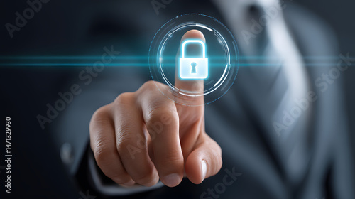 Businessman Touching Virtual Lock Icon Over Transparent Data Screen