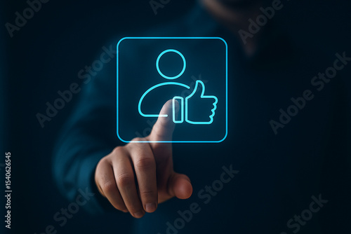 Businessman Touching Virtual Thumbs Up Icon for User Approval Concept in Futuristic Interface with Clean Dark Background Lighting