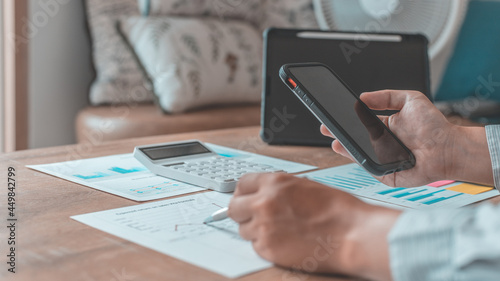 Businessman uses a mobile phone to examine financial data and analyze company growth graphs, Use of smartphone technology in work, Earnings Insights Graph, Finance, Accounting, Tax system, Vat.