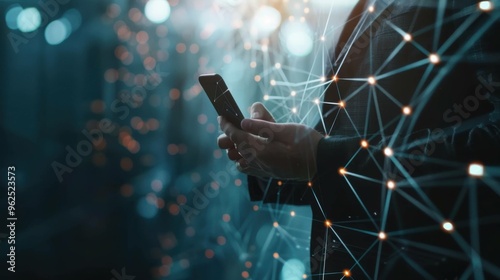 Businessman using a smartphone for global internet connection, leveraging digital marketing, financial services, banking, and big data technologies for business and digital link applications.
