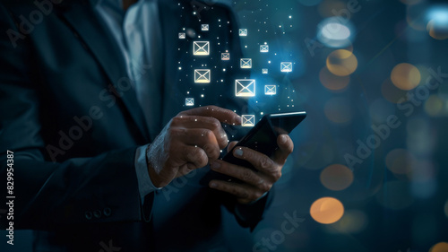 Businessman using a smartphone to receive email messages on a virtual screen, depicting a business email marketing concept. Warning notification and spam message.