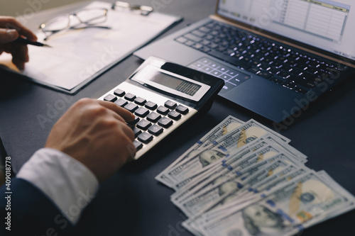 Businessman using calculator and laptop for calculate bills Finances, savings and economy concept. Tax and accounting.