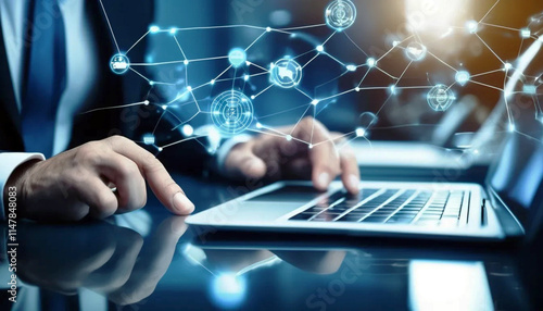 Businessman using digital tablet and laptop with global network connection