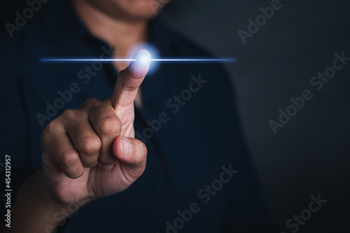 Businessman using finger touching on virtual screen. Futuristic business and IT presentation background. Space for text. Innovation technology computer and business concept