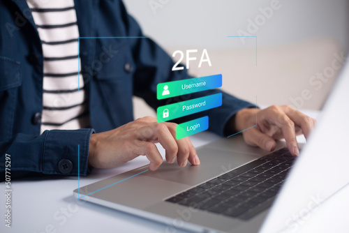 Businessman using laptop and touching virtual screen for two-factor authentication for safety use of social networks and access to information privacy