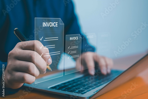 Businessman using laptop with digital invoice documents on virtual screen, symbolizing online billing, financial management, accounting, and modern business technology solutions.
