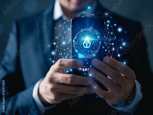 Businessman using mobile phone with cyber security technology for protecting personal data and secure internet access
