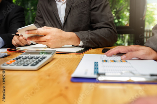 Businessman using smart phone while conference. Businessmen discussing together in meeting room. Business team meeting and discussing project plan.