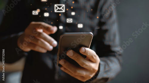 Businessman using Smart Phone with the email, call phone, address, Chat message icons, hotline, concept of using internet technology to contact customers.