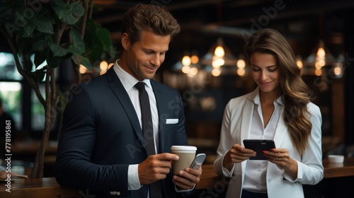 businessman using smartphone and businesswoman holding coffee cup in coffee shop