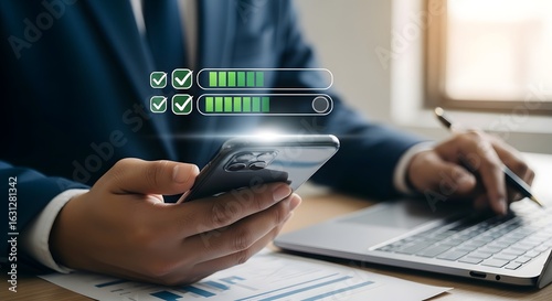 Businessman using smartphone and laptop with progress bars and checkmarks