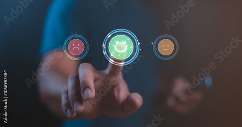 Businessman using smartphone pushing smile green button for the best evaluation, customer satisfaction concept. Give feedback icon satisfaction survey, evaluation, review, feedback, service excellent