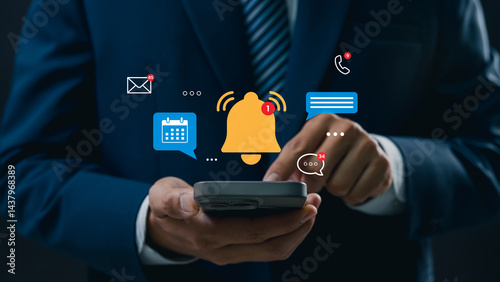 Businessman using smartphone to manage multiple notifications, including email, calendar events, phone calls, and messages, representing business communication, digital connection, and productivity
