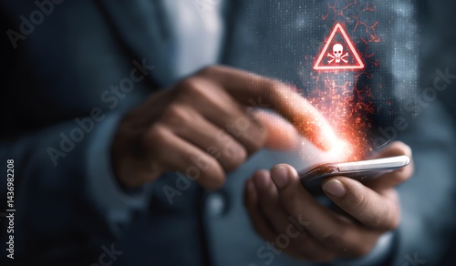 Businessman using smartphone with electronic email hacking and spam warning symbol. cyber attack network, virus, spyware, Cyber security and cybercrime