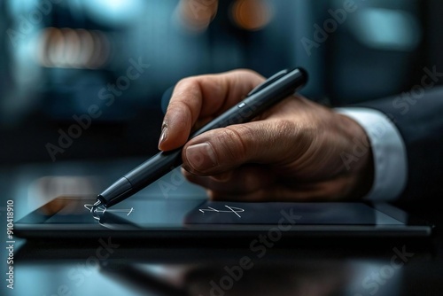 Businessman Utilizing Electronic Pen to Sign Off on Virtual Document for Paperless Quality Assurance and ERP Management: Check and Approval Concept.