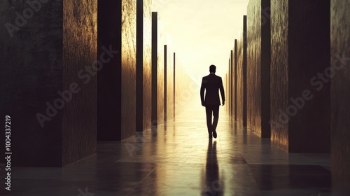 Businessman walking forward in a 3D illustration, representing growth, determination, and strategic advancement in business.