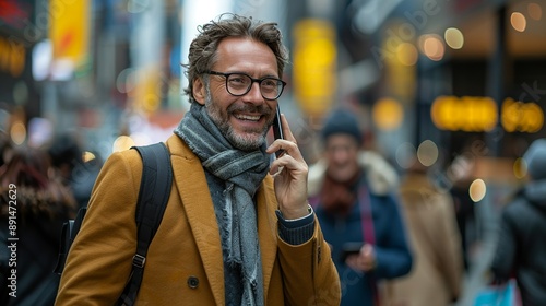 Businessman walking through a crowded city square, smiling as he talks on his phone, capturing the dynamic energy of urban business life realistic photo, high resolution , Minimalism,