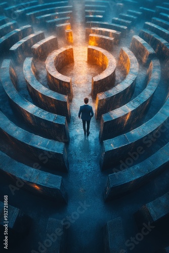 Businessman Walking Through a Mystical Stone Maze with Glowing Pathways in a Foggy Atmosphere