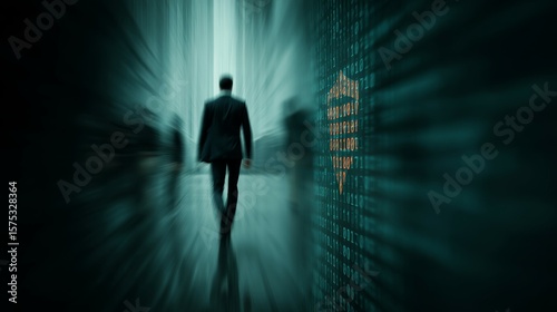 Businessman Walking Through Digital Corridor Representing Technology and Innovation