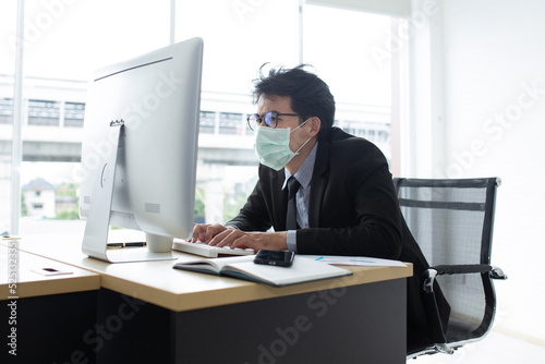 Businessman wearing a protective mask safe Covid-19 or corona virus working environment. Young businessman in glasses and face mask working in his personal office. Business during quarantine.