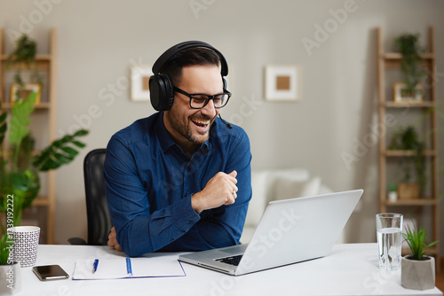 Businessman wearing headset working from home office having a video conference on laptop and laughing
