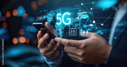 Businessman with 5G hologram on his hand and element of this image furnished, smart city and network connect concept