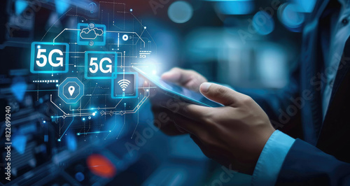 Businessman with 5G hologram on his hand and element of this image furnished, smart city and network connect concept