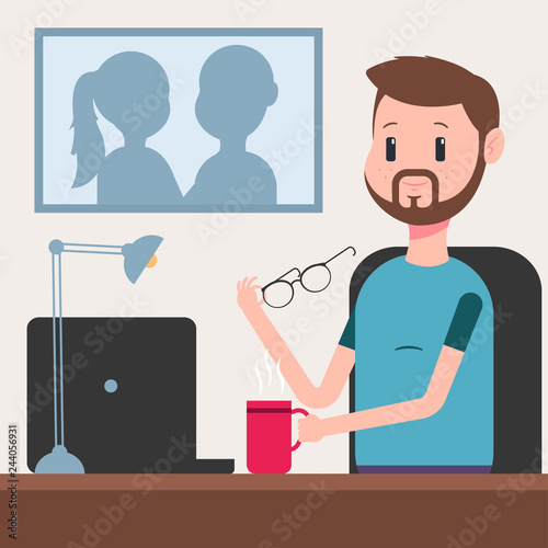 Businessman with a laptop and a cup of coffee working behind an office desk. Vector cartoon character of a bearded man isolated on background.