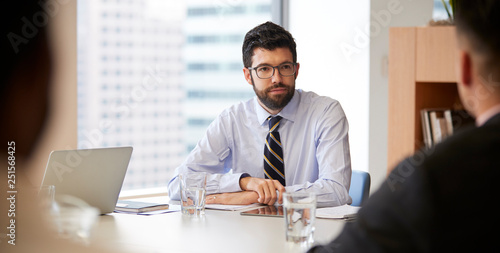 Businessman With Digital Tablet Sitting At Table Meeting With Colleagues In Modern Office