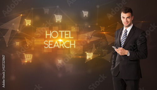 Businessman with shopping cart icons and HOTEL SEARCH inscription, online shopping concept