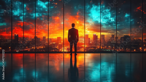 Businessman with suit looking cityscape background. Successful businessman concept