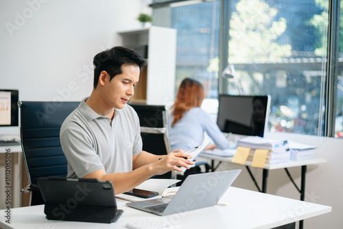 Businessman working with laptop, tablet, and notes. Perfect for business, finance, accounting, and corporate strategy themes