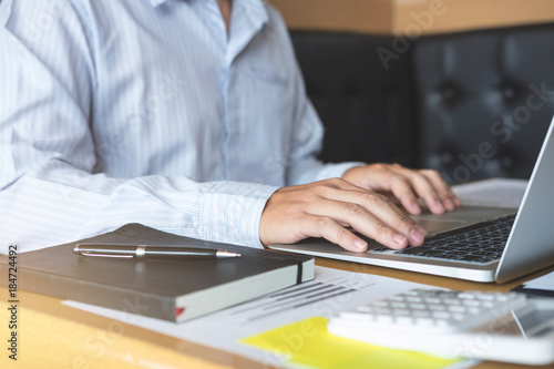 Businessman working new start up project plan and business strategy with laptop computer in office