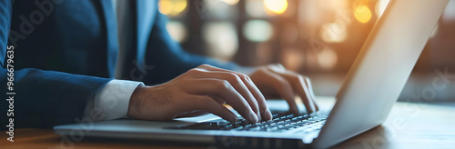 Businessman working on laptop keyboard. Panoramic business banner with copy space.