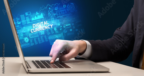 Businessman working on laptop with DIGITAL CURRENCY inscription, cyber technology concept