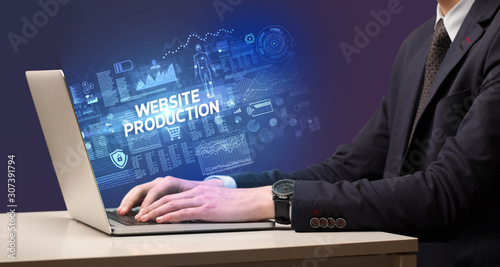 Businessman working on laptop with WEBSITE PRODUCTION inscription, cyber technology concept