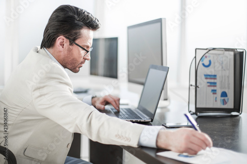businessman writing down information in a notebook