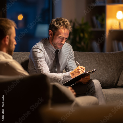 Businessman writing on clipboard during evening meeting in office