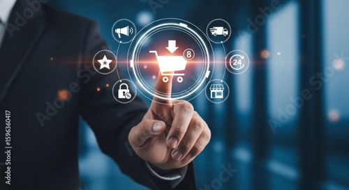 Businessman's finger touches a digital shopping cart interface representing online commerce with icons for delivery, store, security, and promotion.