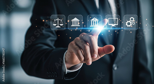 Businessman's finger touches law, governance, monitor, and automation icons with bright flare