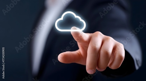 Businessman's hand gesturing towards a glowing cloud-shaped digital icon, representing cloud computing, data storage, and technological innovation.