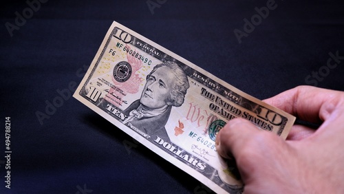 Businessman's hand holding American Dollar Banknotes, isolated on black background. Business Investment Economy Saving Loan Income Money and Finance concept. Ten Dollar, 10 USD. Prosperity concept.