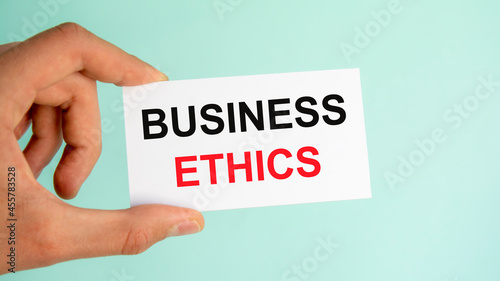businessman's hand holding paper business card with text business ethics, closeup light blue background