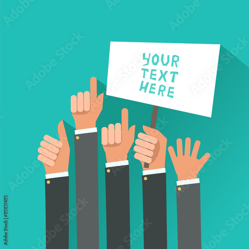 Businessman's hands, gestures. A lot of hands hold a placard. Vector illustration in flat style isolated on blue