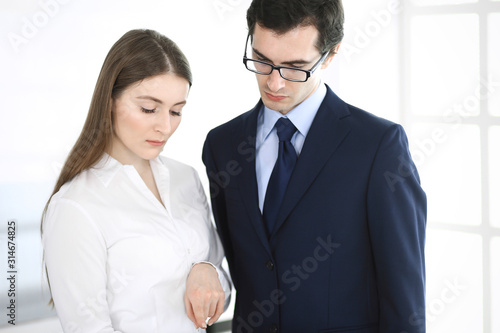Businessmen and woman using tablet computer in modern office. Colleagues or company managers at workplace. Partners discussing contract. Business concept