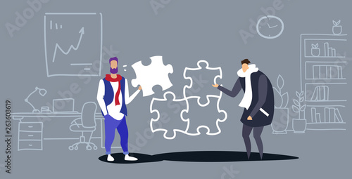 businessmen colleagues putting parts of puzzle together problem solution teamwork concept business people coworking modern office interior sketch doodle horizontal full length