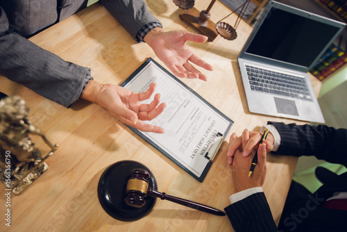 Businessmen consult with lawyers, submit additional documents, and pay for lawyers' services. After reaching an agreement and signing the contract, the two shake hands. Concept, Justice, and Lawyers