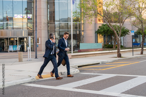 Businessmen go to work. Business taliking. Two businessmen in elegant business suits, walking and talking in city street. Colleagues and friends. Two cheerful business men walking outdoors.