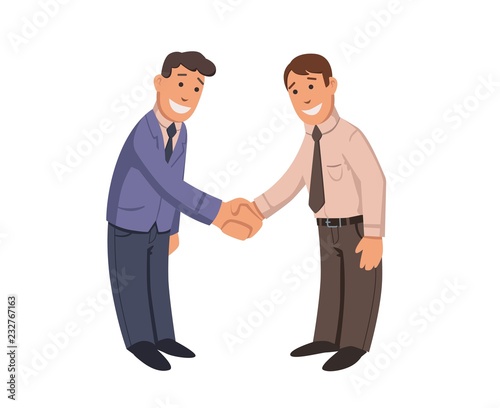 Businessmen handshake. Two smiling men shaking hands. Business deal. Flat vector ilustration. Isolated on white background.