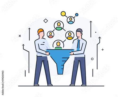 Businessmen looking for suitable customers, filter partners. Cooperation interaction. Success, Cooperation. line icon illustration